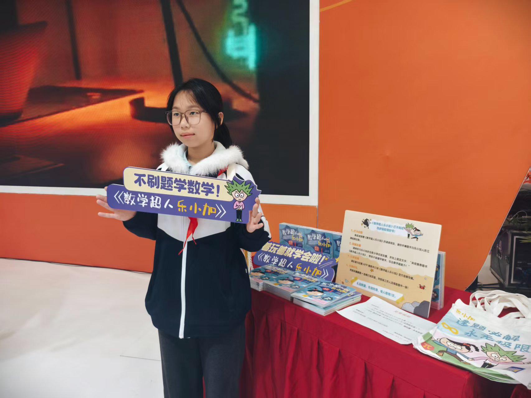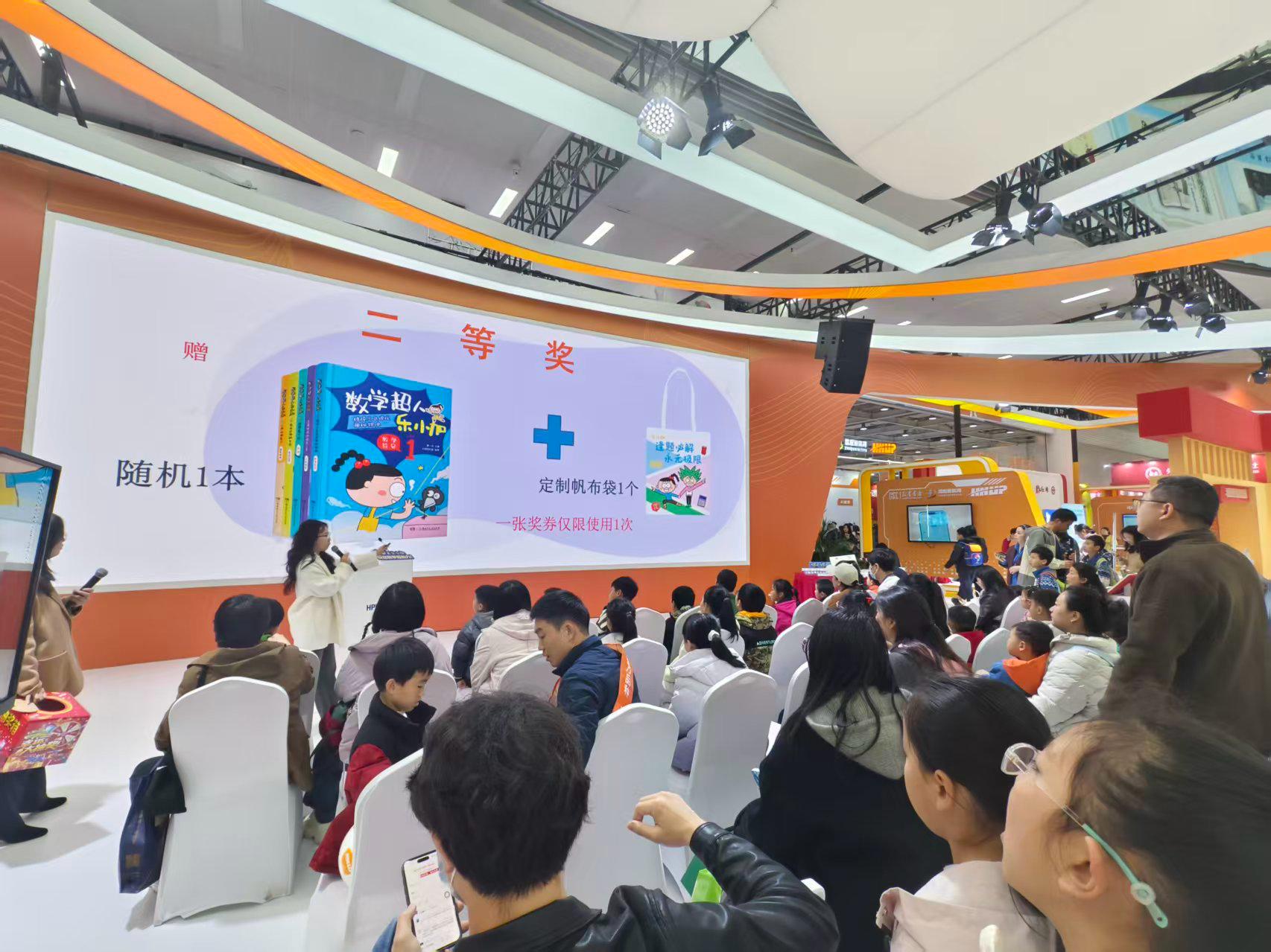 最受期待的数学闯关挑战游戏更是将现场氛围推向高潮。主持人刚亮出题目,台下便瞬间沸腾,小读者们争相举手,有的甚至站起来喊“我来!我来!”。一道道精心设计的趣味数学题贴合儿童认知,孩子们在欢笑声中快速思考、踊跃作答,答对的幸运儿还能上台抽奖——《数学超人乐小加》全套图书、定制帆布袋、购书券等丰厚奖品接连送出,拿到奖品的孩子笑得合不拢嘴,台下也响起阵阵掌声和羡慕的惊呼。